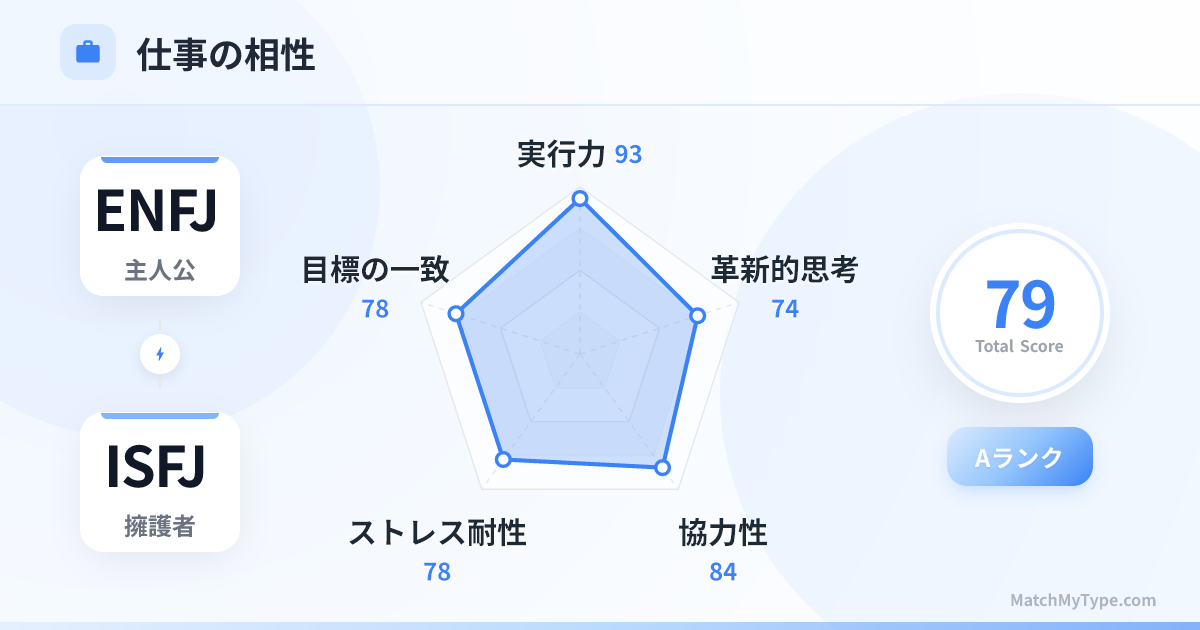 補完性が非常に高いです。ENFJは会議で控えめなISFJの意見を代弁し、ISFJは締め切り前にENFJのケアレスミスやデータの不備をチェックします。互いの手法に干渉しなければ、最高のチームメイトになります。