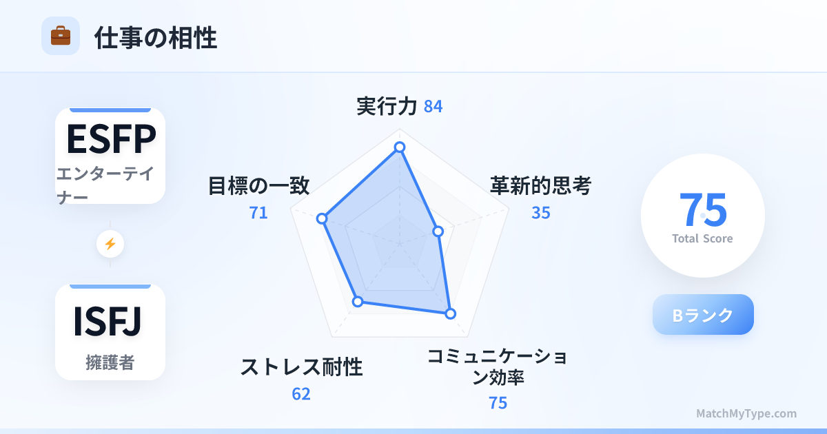 補完し合う良いパートナーです。ブレインストーミングではESFPがアイデアを出し、ISFJがそれを記録して実行可能な案に落とし込みます。ESFPにデータ入力をさせたり、ISFJに準備なしでスピーチをさせたりしないよう注意が必要です。