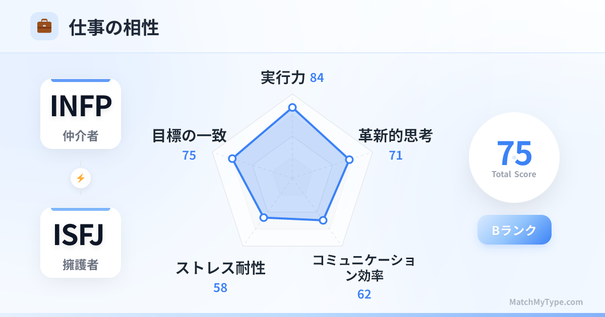 最高のパートナーです。INFPがISFJの献身を褒めることを忘れず、ISFJがINFPの独創性を尊重できれば、非常に生産性の高いコンビになります。INFPがブレインストーミングを、ISFJが実行を担当し、明確な引き継ぎポイントを設けるのがコツです。