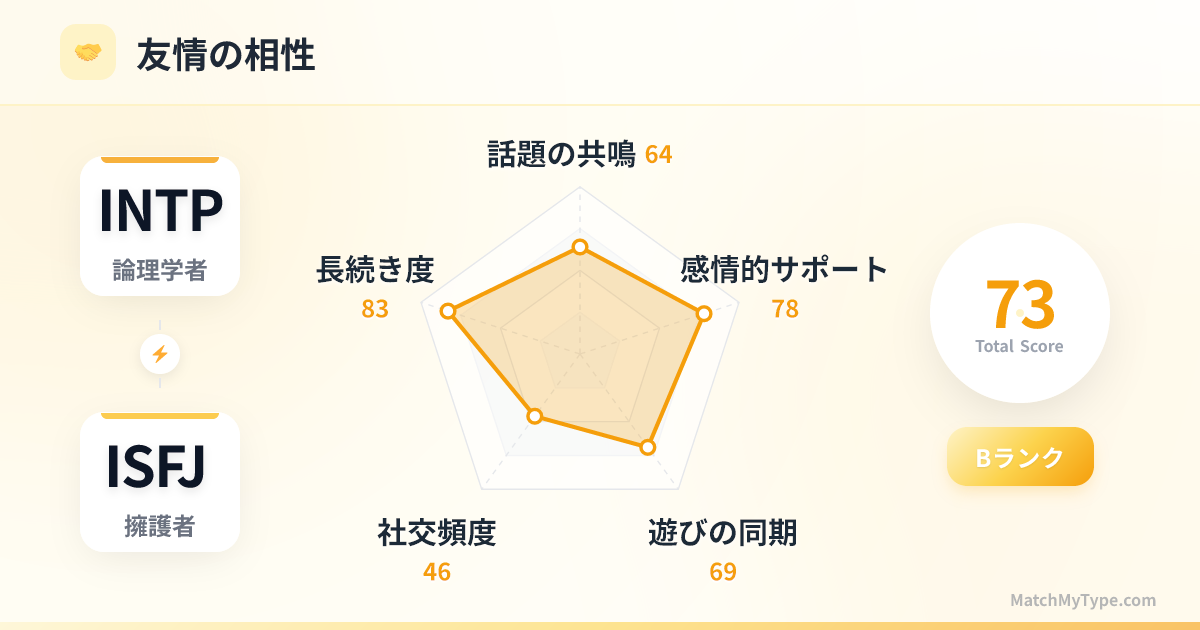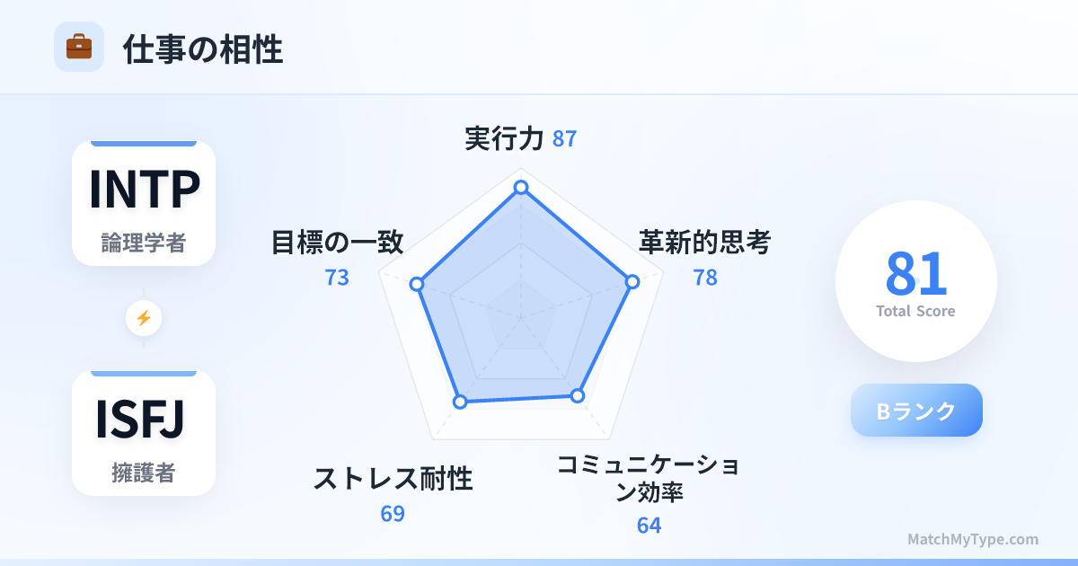 これは「設計者」と「建設者」の組み合わせです。INTPは問題の発見、システムの設計、革新的な案の提案に長け、ISFJは手順通りの実行、プロセスの最適化、確実な着地に長けています。互いの領域を尊重すれば、非常に効率的なパートナーになれます。