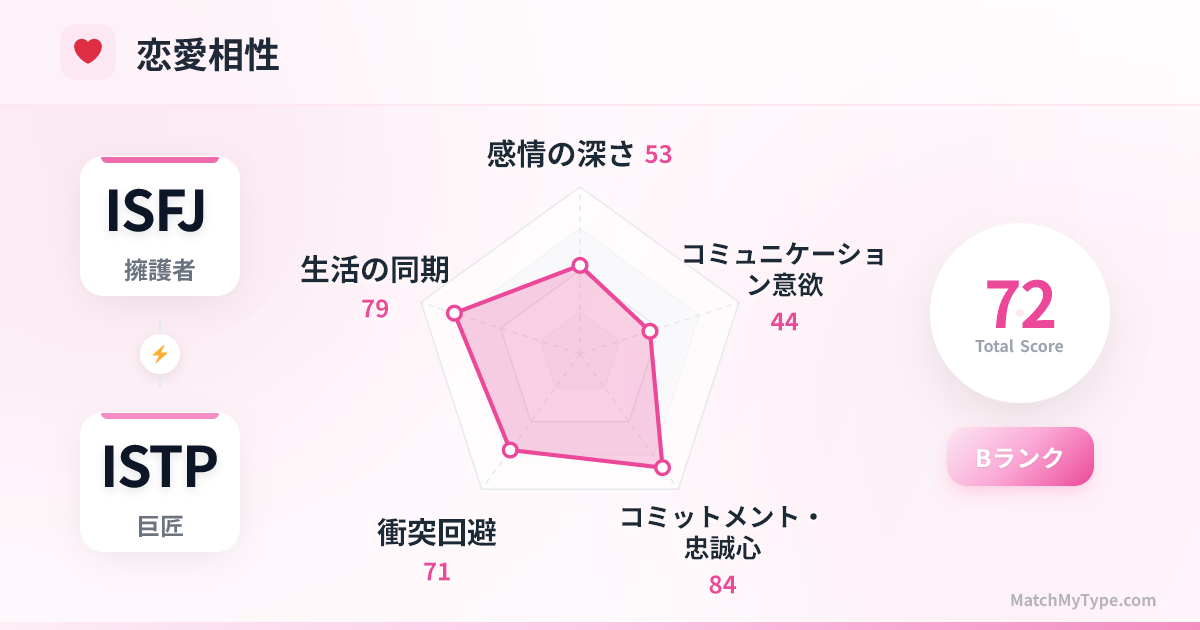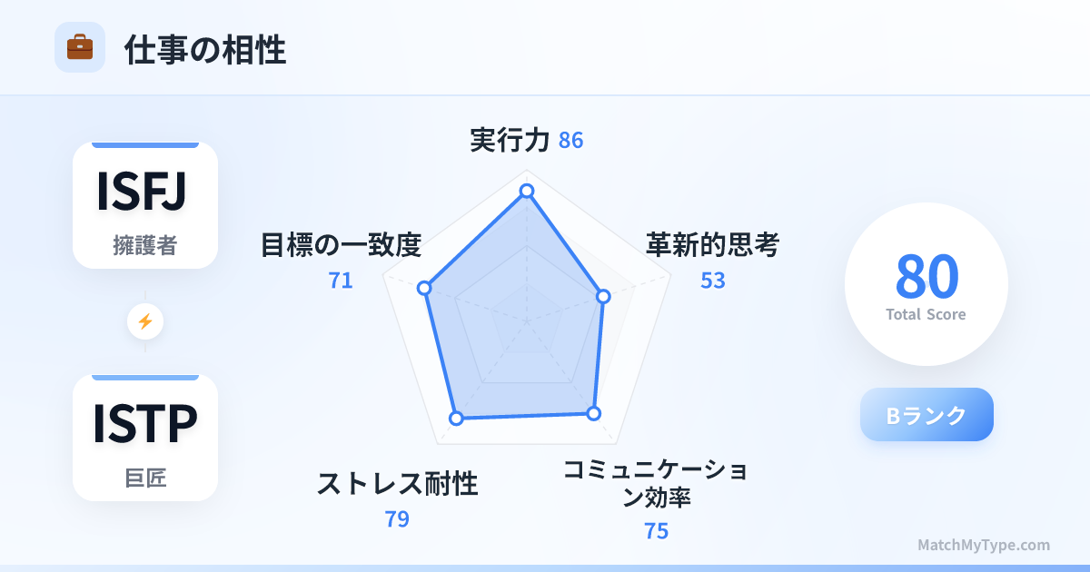 干渉し合わない高効率な関係。役割分担さえ明確なら、最も手のかからないペアです。ISFJが前半の資料収集と整理を行い、ISTPが中盤の処理と分析を行い、最後にISFJが報告とアーカイブを担当するという流れが理想的です。