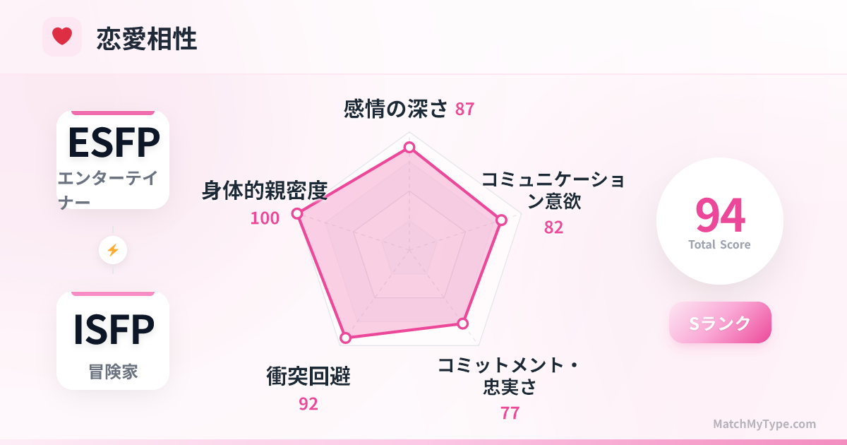 あなたたちは友人グループの中で最も羨ましがられる「遊びの達人コンビ」です。二人がいれば、場が冷めることはありません。ESFPが盛り上げ、ISFPがセンスを添える、まさに天作の合です。