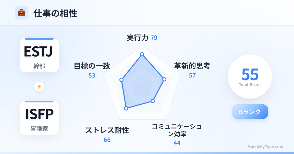 職場では、「マネージャー」と「職人」のコンビです。ESTJが土台を作り、ルールを決め、営業をかけ、ISFPが製品を磨き上げ、デザインを整え、人間味のあるケアを提供します。適材適所なら黄金コンビですが、配置を間違えると地獄の相性になります。