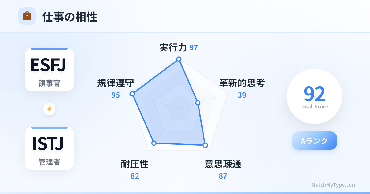 これは職場で最も安心できる「実行力コンビ」です。ENFPやENTPがビジョンを描く人なら、ESFJとISTJはそのビジョンを形にする人たちです。あなたたちは会社の礎であり、プロセスの守護者であり、実行力の代名詞です。