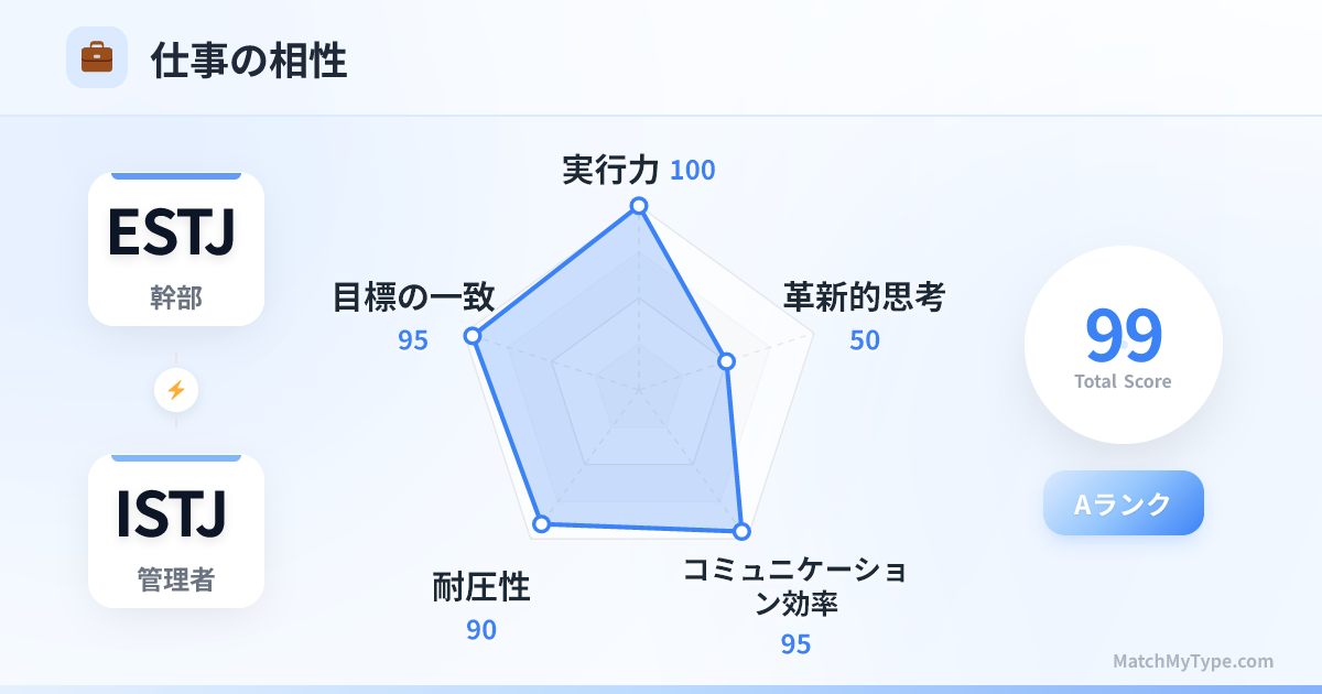 完璧な「フロントとバック」の組み合わせ。ESTJは戦略立案、対外交渉、全体統括に長け、ISTJは細部監査、プロセス管理、リスク管理を得意とします。ESTJが突撃し、ISTJが兵站を確保する。財務、法務、エンジニアリング、行政など、厳格さとルールが求められる分野で無敵です。