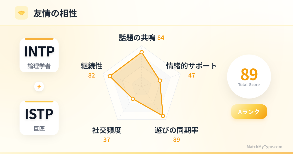 この関係は非常に「静か」ですが、その芯は極めて強固です。INTPとISTPはどちらも世俗的なロマンチックな演出を軽蔑しており、花束やキャンドルはありません。代わりに、互いに役立つリンクを送り合ったり、無言でゲームを楽しんだりする阿吽の呼吸があります。背景説明の8割を省略しても理解し合える、世界で最も気を使わないパートナーになれるでしょう。