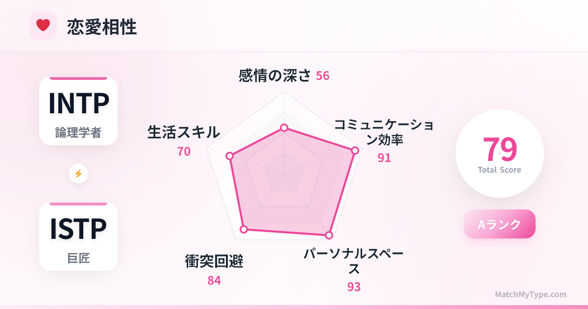 これはTiの二重奏ですが、伴奏が異なります: **Ti (内向的思考) の共鳴**: 関係の核です。善悪の判断基準が完全に一致し、論理的整合性を追求します。会話に無駄がなく、相手の論理の飛躍を瞬時に理解できます。この知的ストレスのなさは、この上なく快適です。 **Ne (外向的直覚) vs Se (外向的感覚)**: 最大の相違点です。INTPのNeは「もし宇宙が爆発したら」といった仮定や飛躍を好みますが、ISTPのSeは「今夜何食べる?」「タイヤの空気圧は?」といった現在の体験に集中します。INTPはISTPを「現実的すぎて想像力に欠ける」と感じ、ISTPはINTPを「空想ばかりで非現実的だ」と感じることがあります。 **Fe (外向的感情) の劣等**: 両者ともFeが第四機能です。つまり、二人とも「感情表現が苦手な人」です。どちらも先に「愛してる」とは言いたがらず、情緒的な問題に直面すると、逃避するか論理で分析しようとします(大抵うまくいきません)。