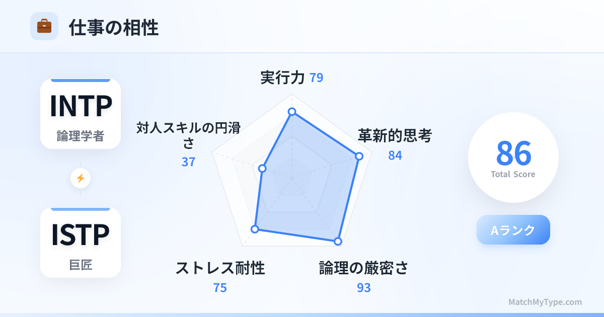 理論と実践の完璧なサイクルです。INTPはシステム上の論理的欠陥を見つけ、最適化案を出すのが得意です。ISTPは手元のツールを使って目の前の故障を迅速に直すのが得意です。INTPが方向を示し、ISTPが道を切り拓きます。プログラミング、エンジニアリング、外科手術、捜査などの分野で高い適合性を示します。