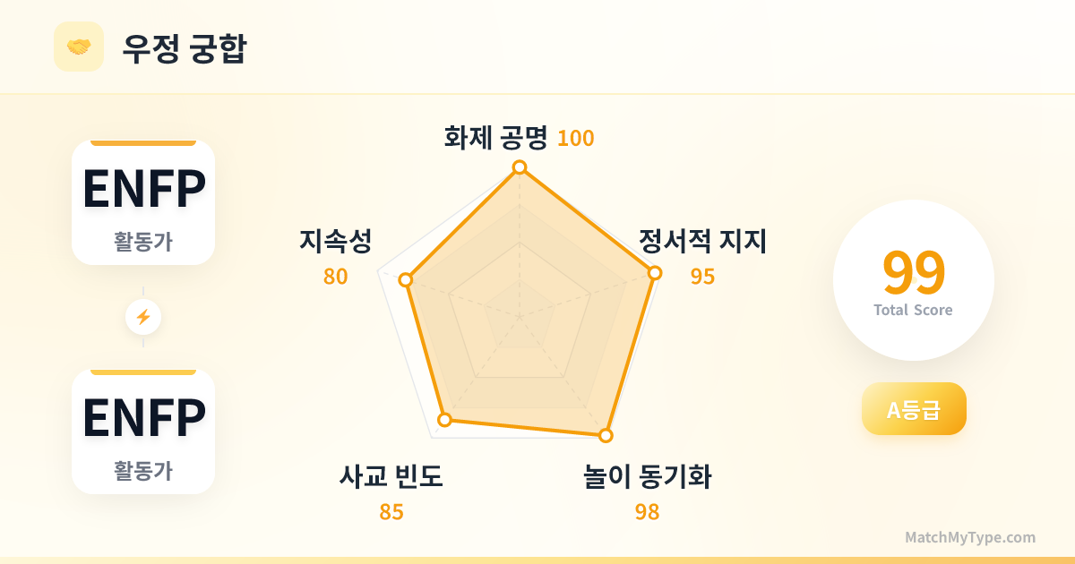 이것은 '거울을 보는 듯한' 놀라움입니다. 세상 속에서 ENFP는 종종 '너무 시끄럽다'거나 '비현실적이다'라는 오해를 받지만, 다른 ENFP를 만나는 순간 전례 없는 수용감을 느낍니다. 상대방이 던진 농담을 즉시 받아치고, 우주의 기원부터 오늘 저녁 메뉴까지 끊임없이 대화가 이어집니다. 이러한 고밀도의 정신적 공명과 말하지 않아도 통하는 느낌은 도파민을 미친 듯이 분비시키며, 마치 잃어버린 쌍둥이를 찾은 듯한 기분을 느끼게 합니다.