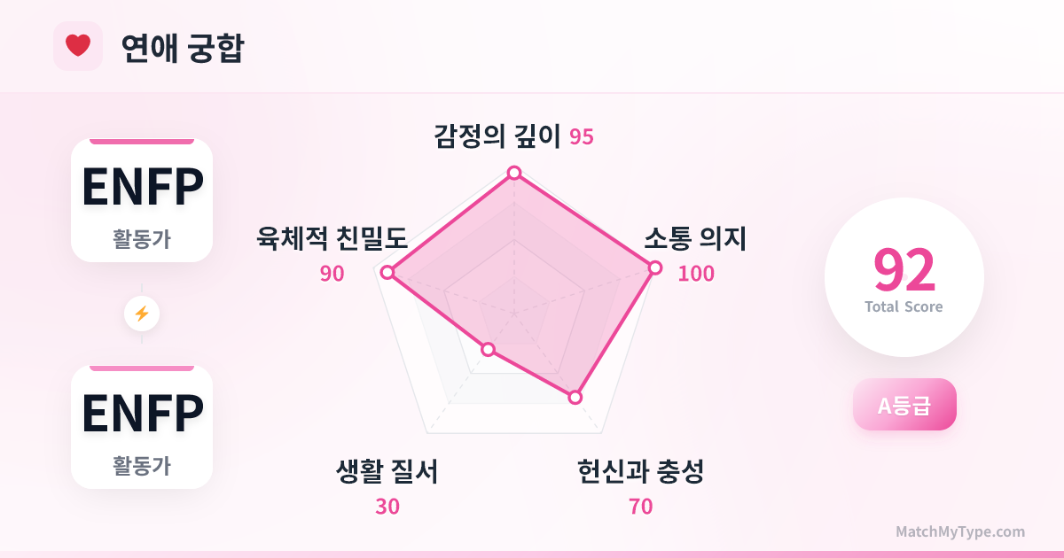 ENFP와 ENFP의 연애는 마치 화려한 불꽃놀이처럼 놀라움, 웃음, 즉흥적인 모험으로 가득합니다. 여러분은 서로의 유머 코드를 설명할 필요도, 자신의 괴짜 같은 면을 숨길 필요도 없습니다. 하지만 불꽃이 사라진 후 마주할 현실적인 문제들(일상의 잡무) 앞에서, 똑같이 자유분방한 두 사람이 견고한 안식처를 만들어낼 수 있을까요?