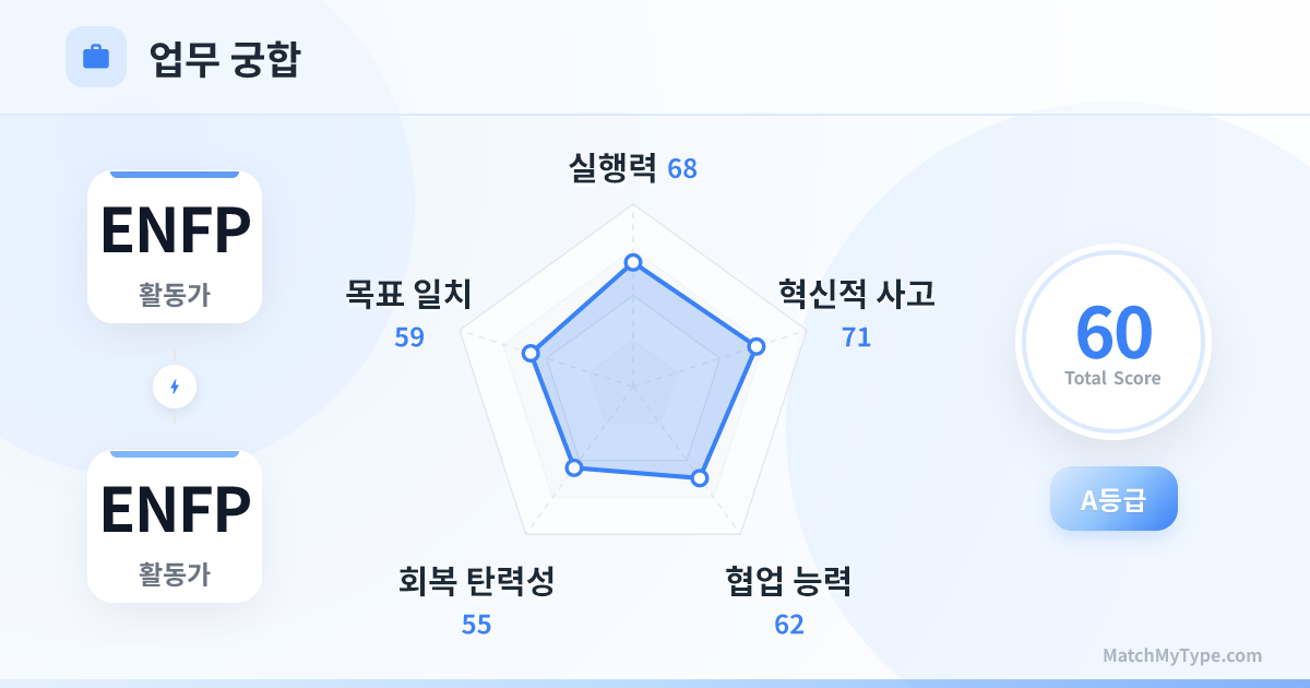 아이디어 브레인스토밍 회의라면 여러분은 무적의 드림팀입니다. 하지만 월말 지출 결의서 작성이나 프로젝트 일정 관리라면 재난 현장이 될 수 있습니다. ENFP x ENFP 조합은 영감은 넘치지만 실행력이 극도로 부족합니다.