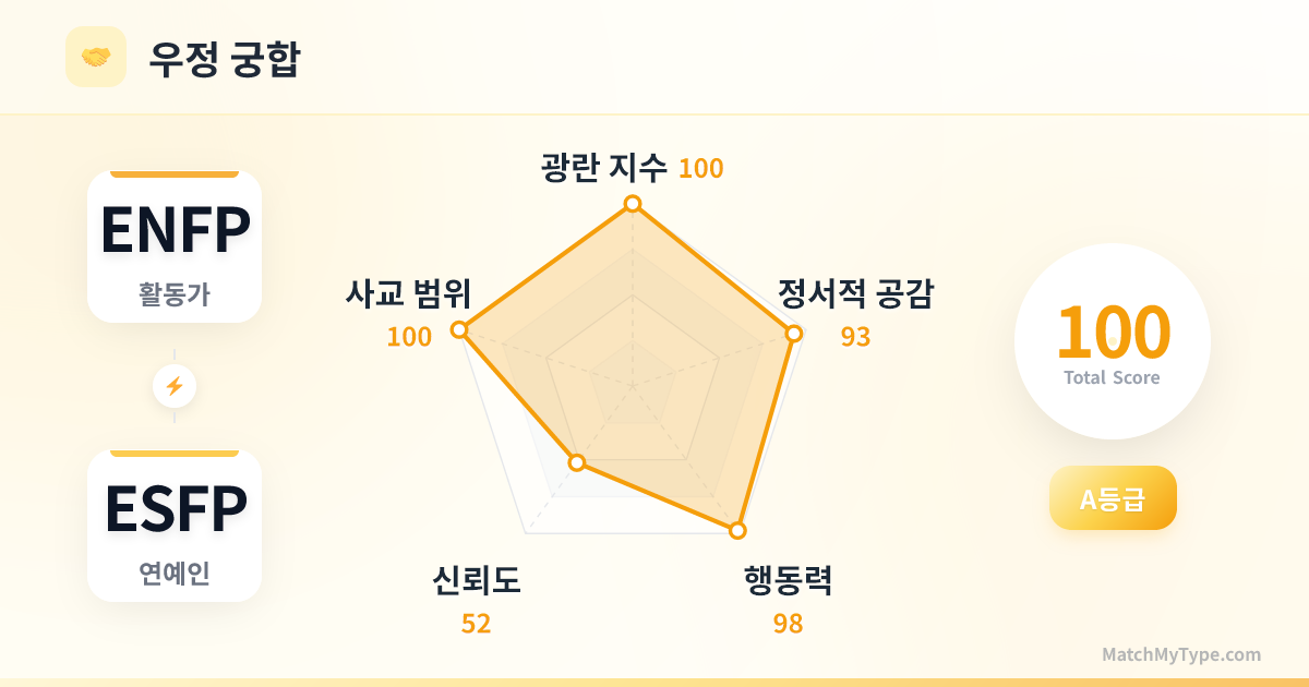 두 배의 외향성(E). ENFP는 사람들과 어울릴 때 흥분하고, ESFP는 무대의 중심이 됩니다. 이들은 어떤 지루한 모임도 활기차게 바꿀 수 있는 거대한 에너지를 방출합니다. 다만 ENFP는 사실 '가장 내향적인 외향인'이어서 갑자기 혼자만의 시간이 필요할 때가 있습니다. 이때 ESFP는 '한창 재밌는데 왜 가?'라며 당황할 수 있으므로 ENFP의 주기적인 혼자만의 시간을 이해해 줄 필요가 있습니다.