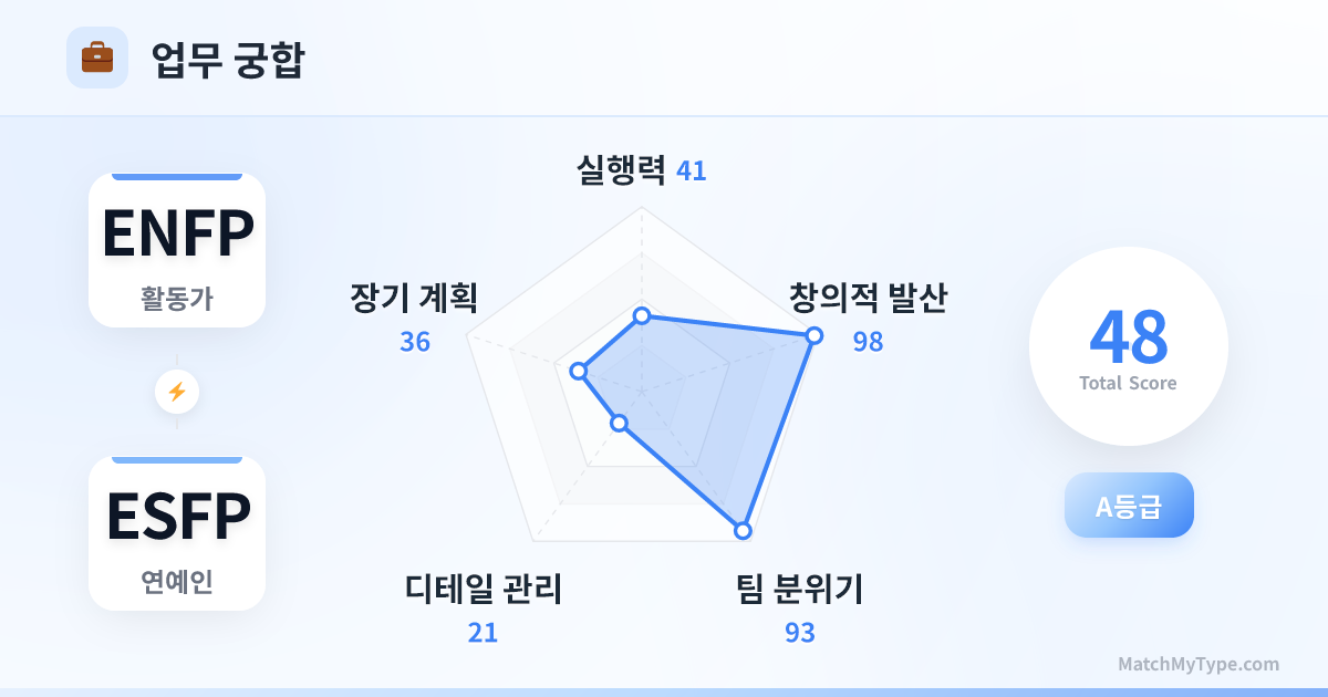 실무형 리더. ESFP 상사는 결과와 행동을 중시합니다. ENFP 직원이 실행 불가능한 공상적인 아이디어만 낸다면 ESFP는 이를 '비현실적'이라고 치부할 수 있습니다. ESFP는 ENFP의 전략적 제안이 혁신의 열쇠가 될 수 있음을 이해하고 경청해야 합니다.