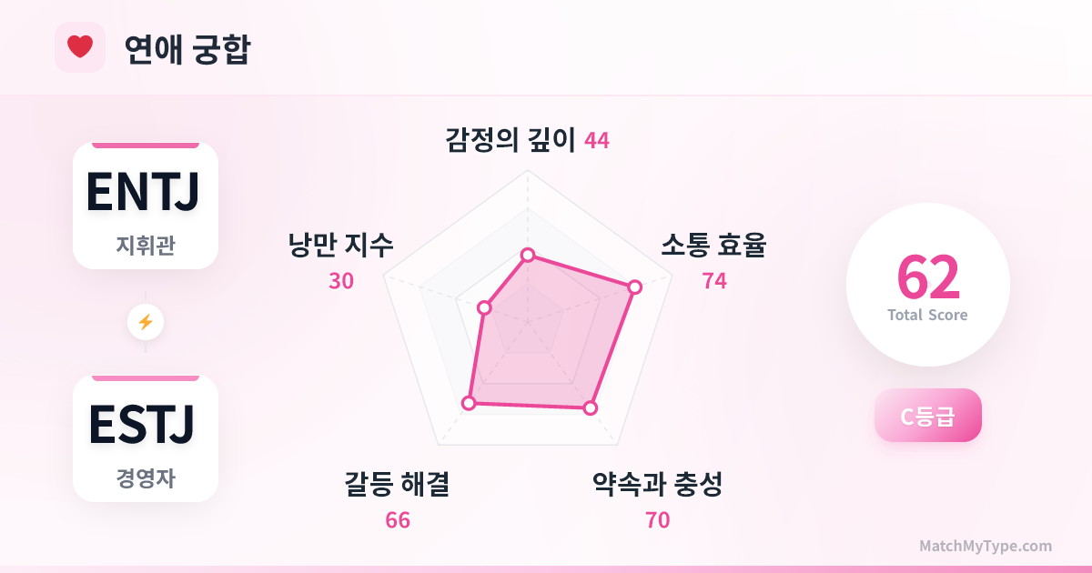 '사피오섹슈얼'과 '강함에 끌리는 성향'의 종착지입니다. ENTJ는 ESTJ의 신중함, 신뢰성, 놀라운 실행력을 높이 평가하고, ESTJ는 ENTJ의 원견, 아우라, 거대한 통찰력을 높이 평가합니다. 미루기와 감정 과잉이 판치는 세상에서, 여러분은 서로를 유일한 동류로 봅니다. 즉, 내 속도를 따라올 수 있고 아이처럼 돌볼 필요가 없는 성인입니다. 이 매력은 상대방의 「능력」과 「야망」에 대한 높은 인정에서 비롯됩니다.