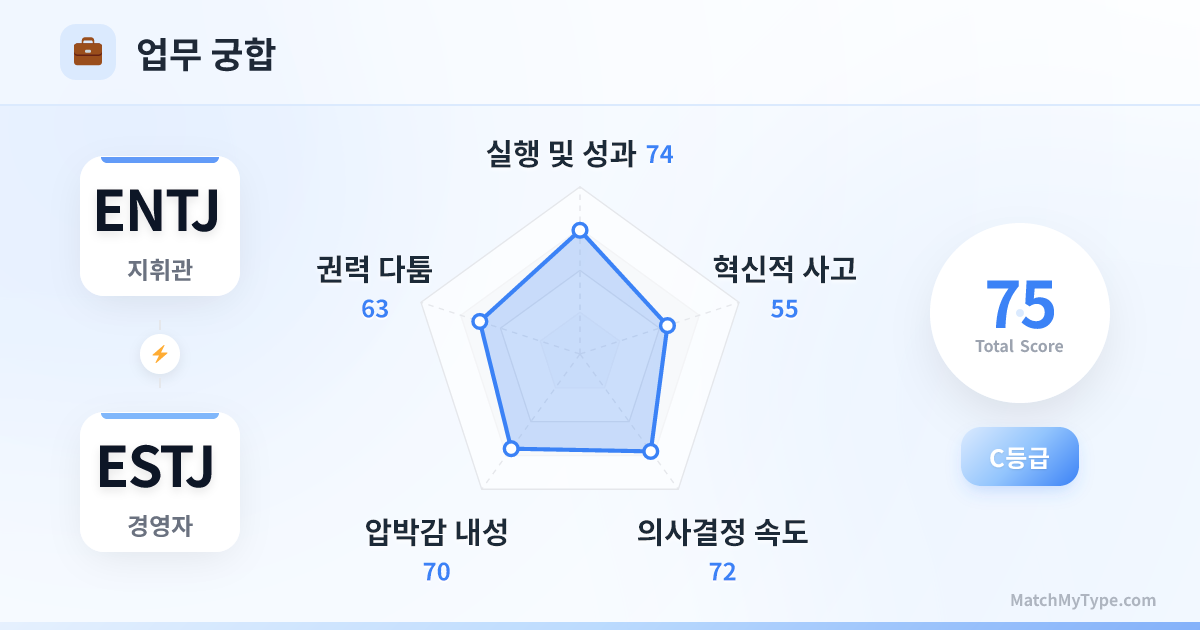 전략과 전술의 완벽한 폐쇄 루프. ENTJ는 거시적 차원의 장기 전략 수립, 비전 제시, 혁신(Ni)에 능하며, ESTJ는 이러한 전략을 구체적인 프로세스, 제도, KPI로 분해하여 팀의 성과를 이끌어내는 데(Si) 능합니다. ENTJ가 가리키는 곳을 ESTJ가 빠르고 정확하게 타격합니다.