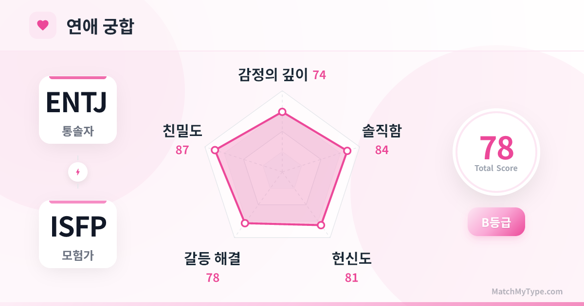 행동력 만점입니다. 두 사람 모두 행동파(Se)이며 공상에 머무는 것을 싫어합니다. ENTJ는 거시적 전략과 자원 통합에 능하고, ISFP는 구체적인 제품 디테일, UI 디자인, 카피의 감성적인 면에서 극강의 퀄리티를 뽑아냅니다. ISFP가 방향성에 동의만 한다면 ENTJ가 가리키는 곳으로 거침없이 달려나갑니다.