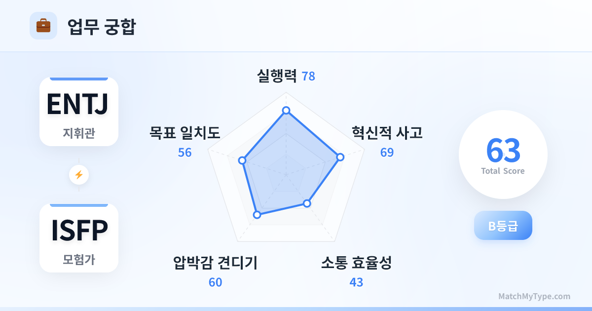 ENTJ는 업무 시 감정을 차단하지만, ISFP는 업무 그 자체가 감정입니다. ENTJ는 ISFP의 감정이 업무 동력의 일부임을 이해해야 합니다. 기분이 좋아야 결과물도 잘 나오므로, ISFP를 달래는 시간은 낭비가 아니라 더 큰 성과를 위한 투자입니다.