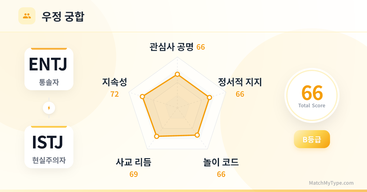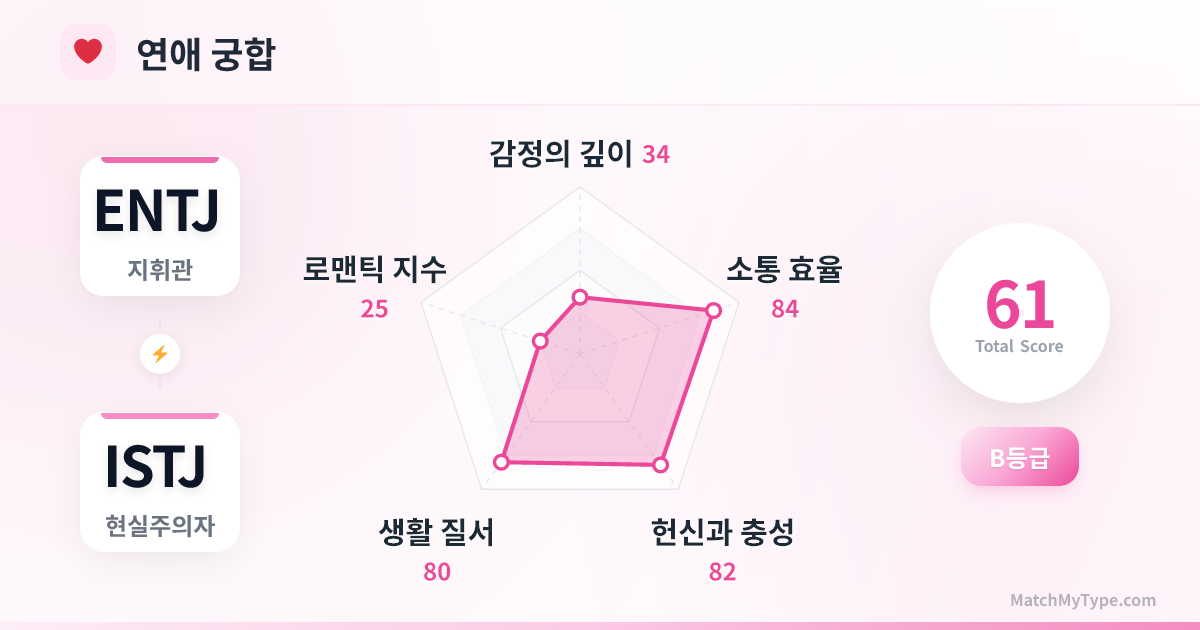 직장에서의 '드림팀'입니다. ENTJ는 키를 잡은 CEO이고, ISTJ는 든든한 COO입니다. '혁신'과 '전통'의 모순만 잘 해결한다면 어떤 경쟁자도 물리치고 난이도 높은 KPI를 달성할 수 있습니다.