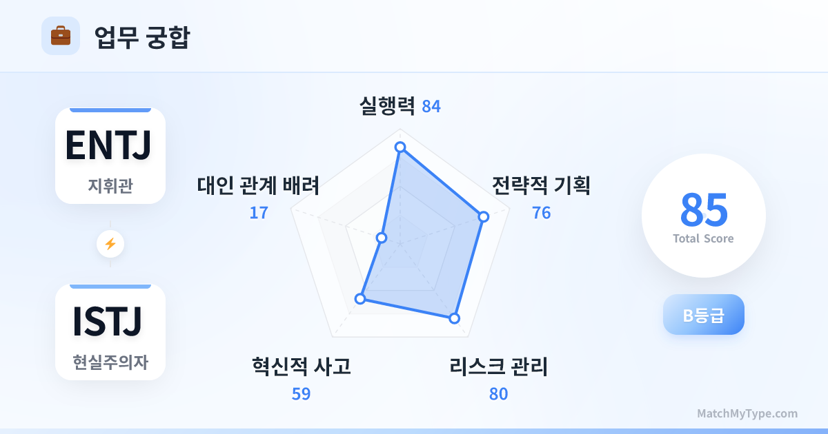 위험이 잠재되어 있습니다. ISTJ 상사는 미세 관리(Micromanagement)를 선호하며 세부 사항과 절차 준수에 집중합니다. 이는 ENTJ 부하 직원에게 극심한 답답함과 제약을 느끼게 합니다. ENTJ는 상사의 권위에 도전하며 개혁안을 제안할 것이고, 이것이 거절당하면 ENTJ는 퇴사하거나 반기를 들 가능성이 큽니다.