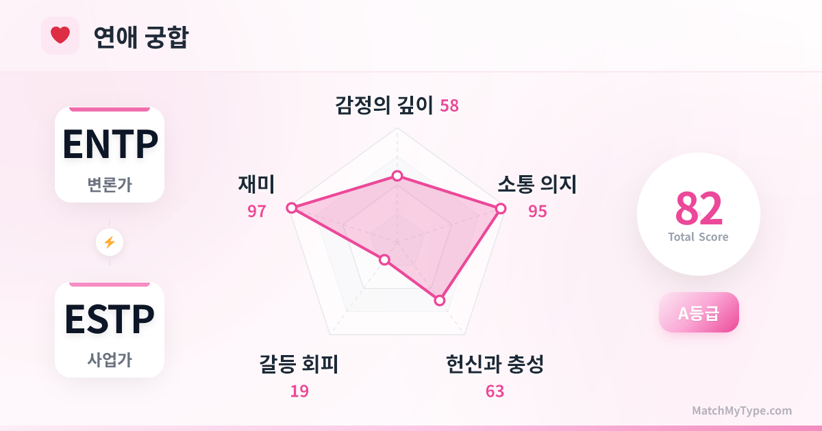 이 관계는 마치 초원을 달리는 두 마리의 표범처럼 속도감, 열정, 그리고 지적 게임으로 가득 차 있습니다. ENTP와 ESTP는 모두 외향적이고 이성적이며 지루함을 극도로 혐오하는 유형(ExTP)입니다. 여러분은 끈적끈적한 감정 확인이 필요하지 않습니다. 눈빛 하나, 농담 한마디, 그리고 즉흥적인 모험이 여러분이 사랑을 표현하는 방식입니다.