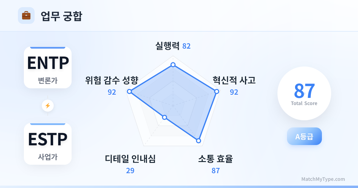 직장에서 이들은 '특수부대'와 같습니다. ENTP는 전략 참모이고, ESTP는 최전방 지휘관입니다. 지루한 행정 서류 작업만 시키지 않는다면 어떤 고지든 점령할 수 있습니다.