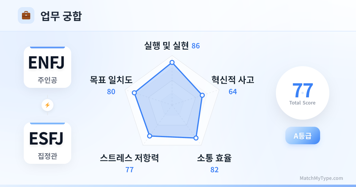 직장에서 이들은 'CEO와 COO' 또는 '정치 위원과 보급 부대장'과 같은 황금 콤비입니다. ENFJ가 비전을 제시하고 동원하며 외부 관계를 해결하면, ESFJ는 이를 분배하고 실행하며 내부 프로세스를 정리합니다. 방향만 일치한다면 당신들의 팀은 응집력과 실행력을 동시에 갖추게 될 것입니다.