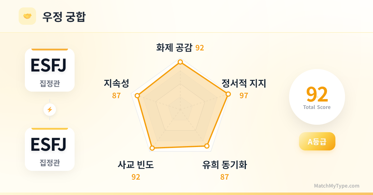 ESFJ와 ESFJ의 결합은 MBTI에서 가장 '현실적'이면서도 따뜻한 조합 중 하나입니다. 여러분은 동일한 사회적 각본과 가치관을 공유하기 때문에 많은 말이 필요하지 않습니다. 이는 '안정감'과 '소속감'에 기반한 깊은 유대이며, 여러분은 함께 난공불락의 가정 요새를 구축할 것입니다.