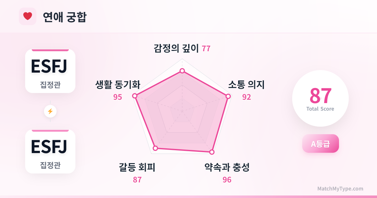 거울을 보는 듯한 만남입니다. ESFJ는 평생 타인을 돌보며 자신을 소홀히 하는 경우가 많은데, 다른 ESFJ를 만났을 때 비로소 '내가 남을 돌보듯 누군가 나를 돌봐준다'는 감동을 느낍니다. 양쪽 모두 기념일, 명절 행사, 가족 모임에 대한 예우를 매우 중요하게 생각하며, 이러한 생활 열정의 동기화는 서로를 평생 함께할 반려자로 빠르게 낙점하게 만듭니다.