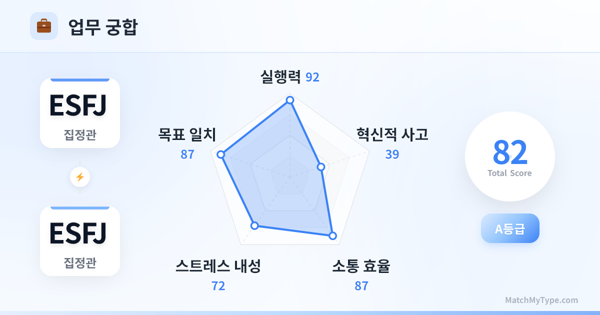 한 팀에 두 명의 ESFJ가 있다면 그 팀의 행정 효율, 행사 조직력, 분위기는 최상급일 것입니다. 여러분은 타고난 실행가이자 접착제이지만, 과감한 개혁이나 추상적인 전략 수립이 필요할 때는 한계에 부딪힐 수 있습니다.