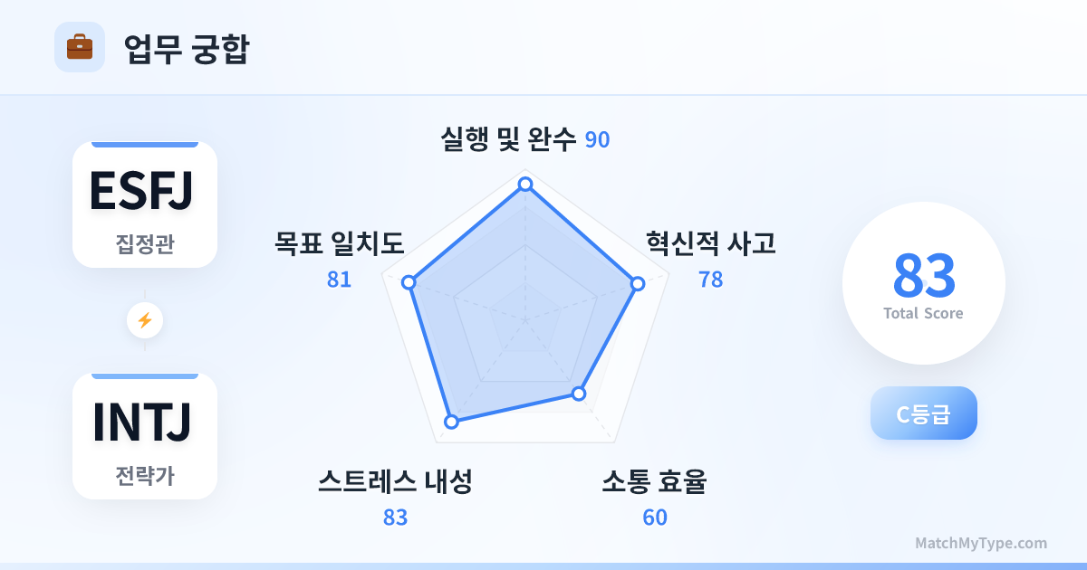 의사결정 근거의 충돌입니다. 회의 중 ESFJ는 '이러면 다들 기분 나빠할 거예요'라고 말하고, INTJ는 '이게 효율이 가장 높아요'라고 말합니다. 중재자가 없으면 논쟁은 평행선을 달립니다. 또한 INTJ는 ESFJ가 수다로 시간을 낭비한다고 생각할 수 있고, ESFJ는 INTJ의 엄격함이 팀 사기를 떨어뜨린다고 느낄 수 있습니다.