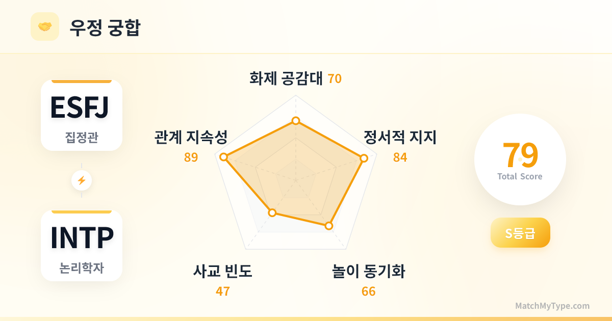 MBTI 이론에서 ESFJ와 INTP는 구성 기능은 같으나 순서가 완전히 정반대인 관계(Fe-Si-Ne-Ti vs Ti-Ne-Si-Fe)를 가집니다. 이를 '이중성(Duality)' 관계라고 합니다. ESFJ는 INTP에게 절실히 부족한 생활의 세심한 보살핌과 사회적 안정감을 제공하고, INTP는 ESFJ가 동경하는 논리적 지혜와 독립적 사고를 제공합니다. 다름에서 시작해 의존으로 끝나는 견고한 관계입니다.