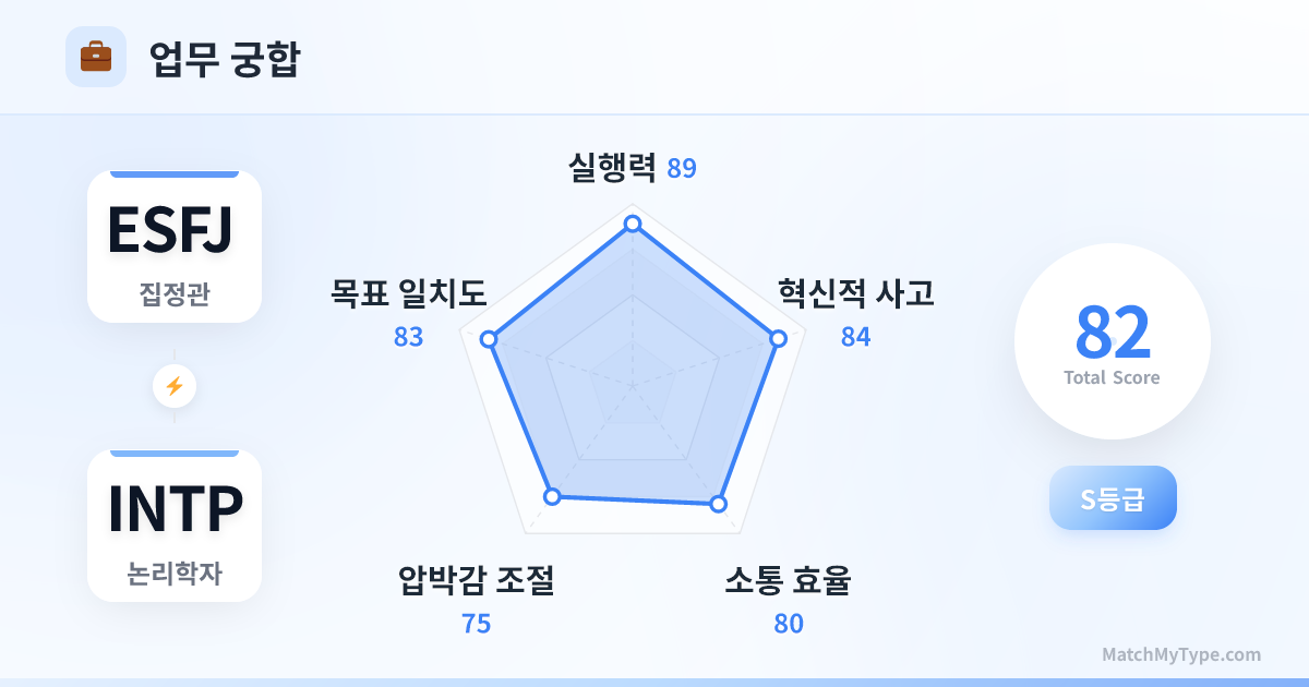 직장에서 이들은 '드림팀'입니다. ESFJ는 대인 관계 조정, 프로세스 관리, 행정 업무에 능숙하고, INTP는 전략 기획, 시스템 구축, 난제 해결에 능숙합니다. 소통만 원활하다면 해결 못 할 프로젝트가 없습니다.
