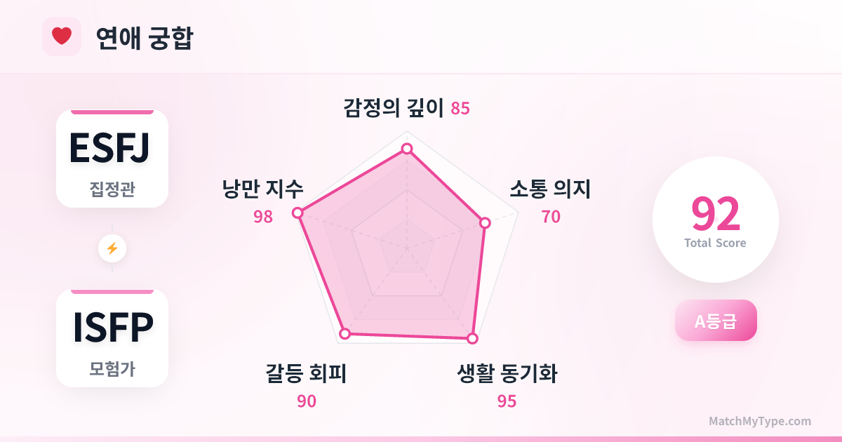 ESFJ와 ISFP의 만남은 정성스럽게 꾸며진 아늑한 거실에 자유롭고 소중한 예술 작품 하나가 놓인 것과 같습니다. ESFJ는 ISFP에게 절실한 안정감과 소속감을 제공하고, ISFP는 규칙적인 ESFJ의 삶에 다채로운 색깔과 놀라움을 선사합니다. 이들은 감각적 경험과 삶의 질을 매우 중요하게 생각하는 조합입니다.