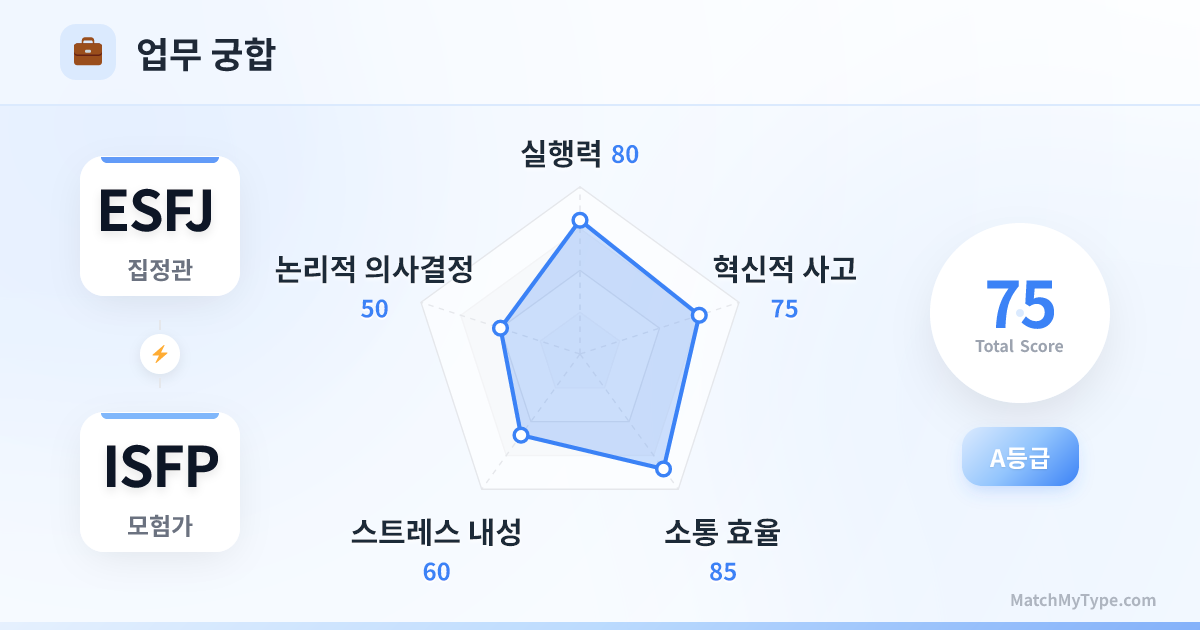 사무실의 활력소 조합입니다. 함께 음료를 주문하고 가십을 나누며 책상을 꾸미기도 합니다. 프로젝트를 협업할 때는 반드시 역할을 분담해야 합니다. ESFJ는 일정과 마감 관리를, ISFP는 내용과 퀄리티를 책임지세요. 그렇지 않으면 둘 다 마지막 순간까지 미루게 될 수 있습니다.