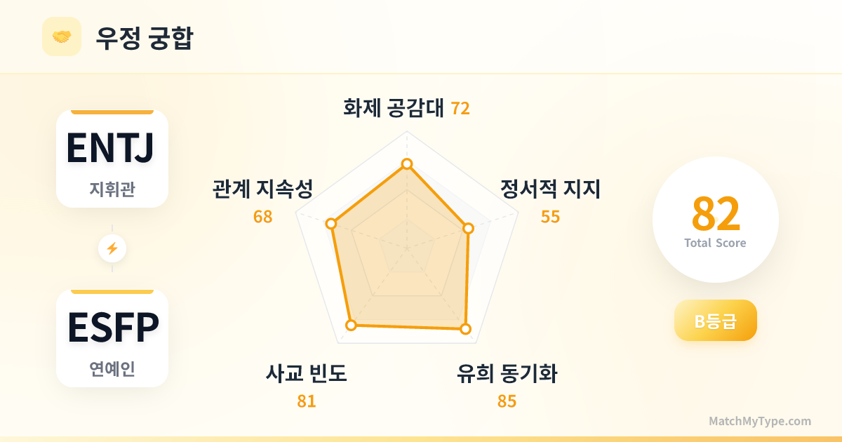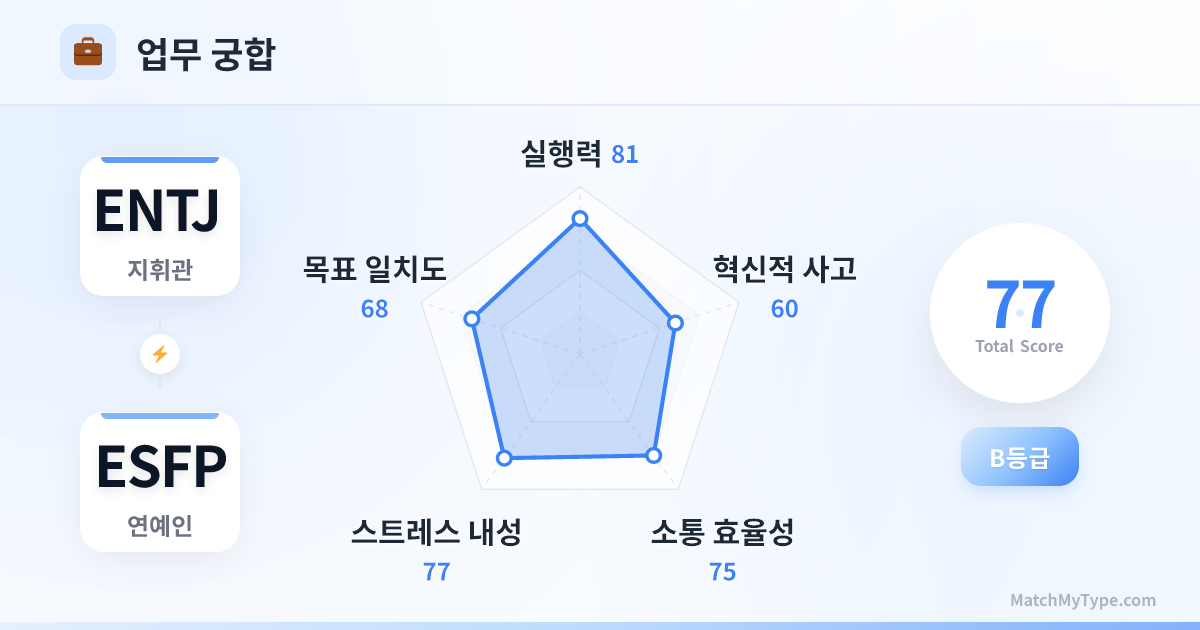 이 조합은 '할리우드 제작자(ENTJ)'와 '인기 스타(ESFP)'의 결합입니다. 두 사람 모두 효율성, 결과, 그리고 폼나는 것을 중시하며 지지부진한 것을 싫어합니다. 목표만 일치한다면 엄청난 속도로 시장을 휩쓸 수 있습니다.