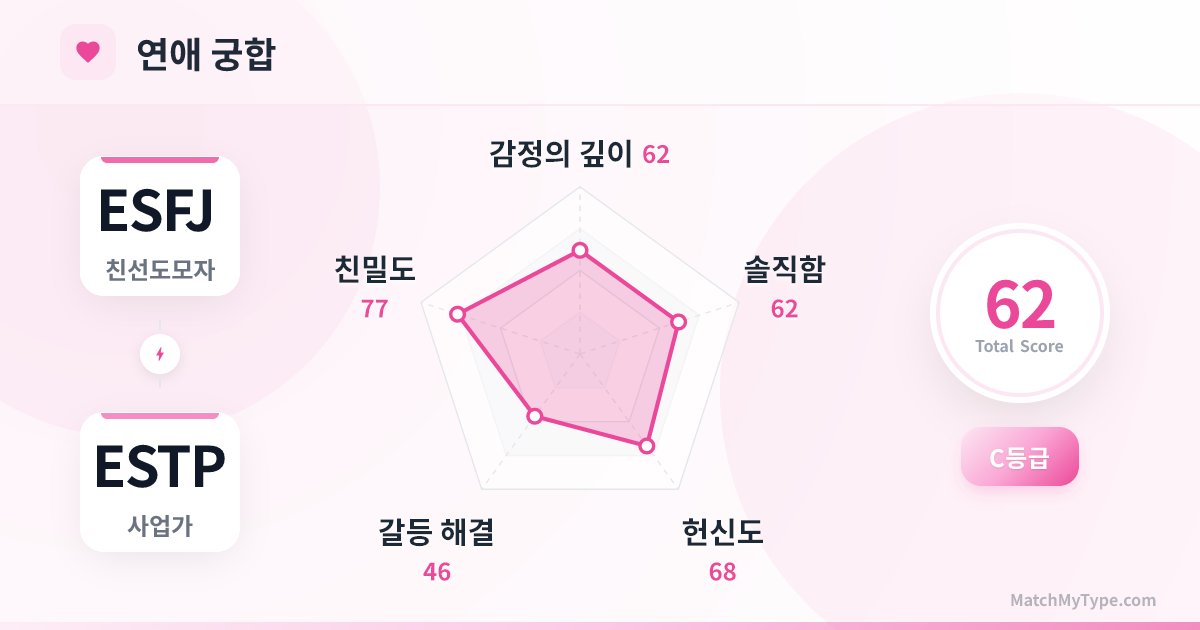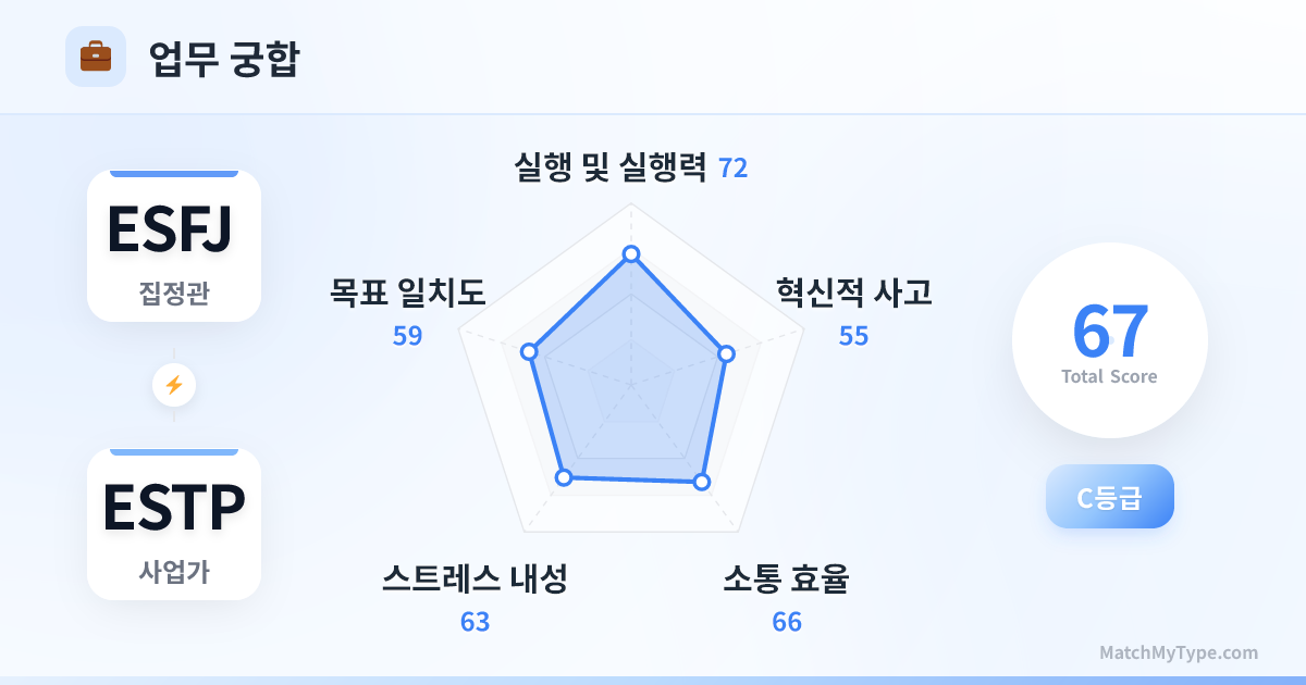 ESFJ는 프로세스, 후방 지원 및 팀 관계 유지에 능하고, ESTP는 문제 돌파, 협상 및 돌발 상황 해결에 강합니다. ESFJ는 ESTP가 따온 계약을 안정적으로 이행하고, ESTP는 ESFJ가 해결하기 어려워하는 '얼굴 붉혀야 하는 일'이나 규칙을 깨야 하는 난제들을 해결해 줍니다.