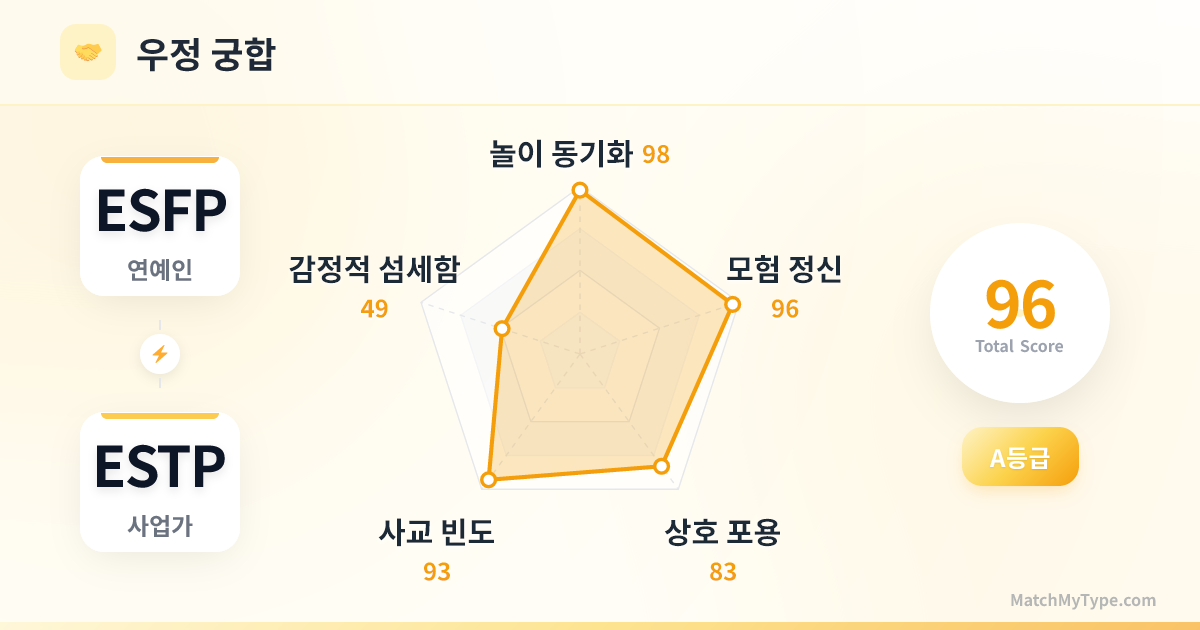 사무실의 분위기 메이커 조합. 불합리한 제도를 함께 비판하거나 몰래 간식을 시켜 먹는 단짝이 됩니다. 하지만 프로젝트 협업 시에는 역할 분담을 명확히 해야 합니다. ESFP는 '소프트'한 업무(카피라이팅, 고객 관리)를, ESTP는 '하드'한 업무(가격 전략, 일정 추진)를 맡는 것을 추천합니다.