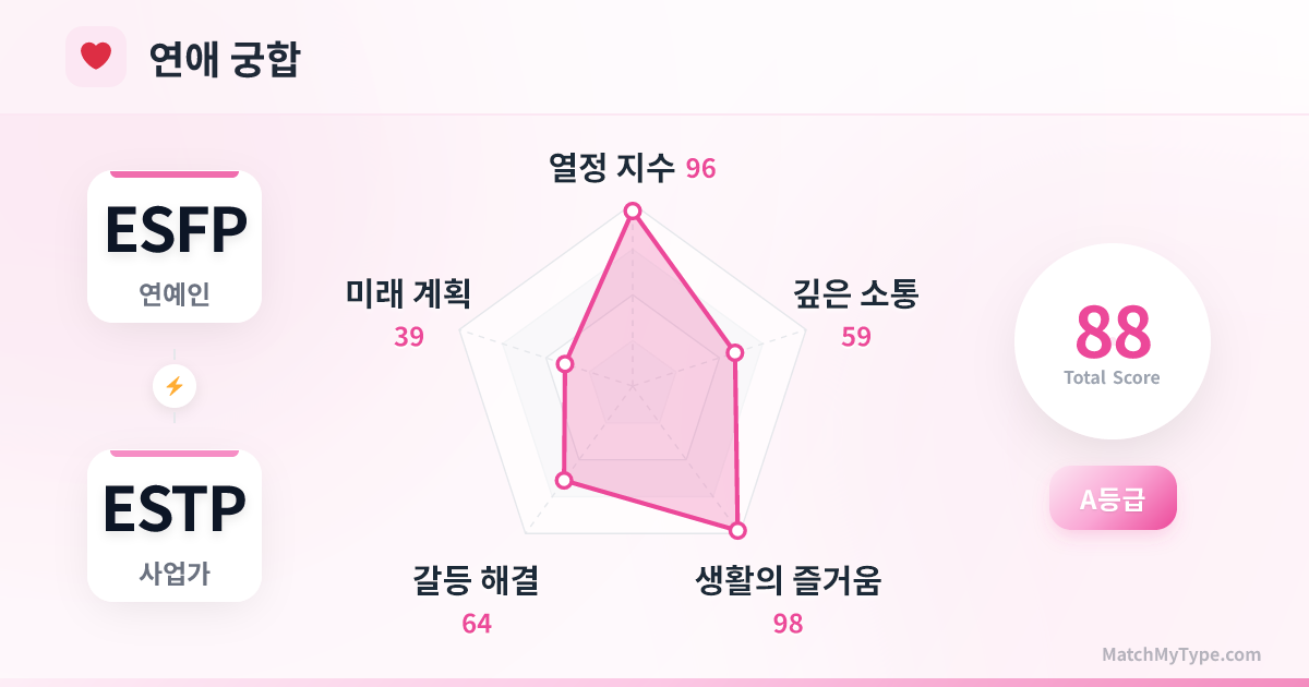 이는 보통 '사랑의 언어'가 다르기 때문입니다. ESFP는 긍정의 말과 감정적 공감이 필요하지만, ESTP의 사랑 방식은 '문제 해결'이나 '재미있는 곳에 데려가기'입니다. ESFP는 직접적으로 말해야 합니다. '지금은 조언이 필요한 게 아니라 그냥 안아줬으면 좋겠어.' ESTP는 보통 기꺼이 응해주지만, 말하지 않으면 모를 뿐입니다.
