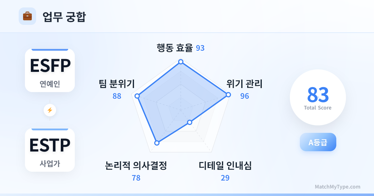 최고의 현장 퍼포먼스. ESFP는 고객의 감정을 사로잡고 인간적 연결을 만드는 데 능하며, ESTP는 비즈니스 기회를 포착하고 협상을 성사시키는 데 탁월합니다. 즉흥 연기, 고압적인 환경 또는 대외 발표(전시회, 로드쇼, 라이브 커머스 등)가 필요한 상황에서 두 사람의 호흡은 완벽합니다.