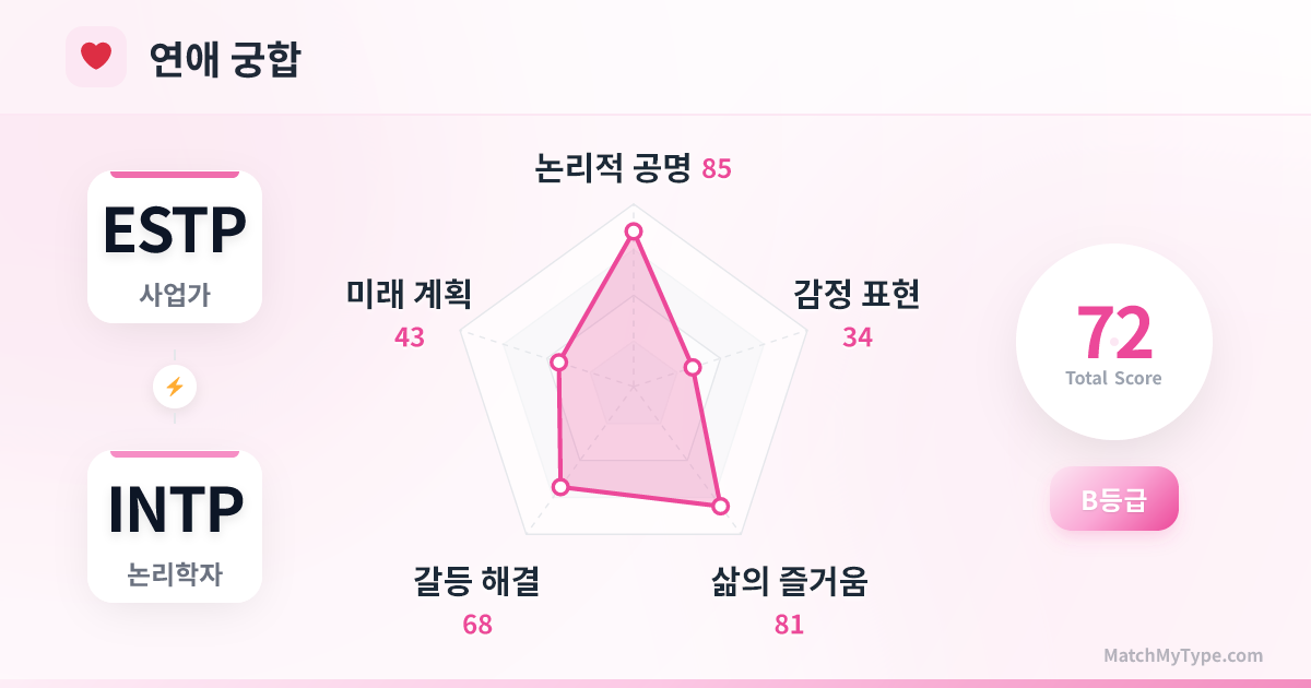 이 조합은 '감정 쓰레기통'이 별로 필요 없는 조합입니다. ESTP와 INTP의 연애는 보통 '지적인 상호 감탄'과 '성격적인 강한 호기심'에서 시작됩니다. 두 사람 모두 드라마틱한 감정 소모를 싫어하며 솔직하고 군더더기 없으면서도 즐거움이 가득한 관계를 추구합니다.