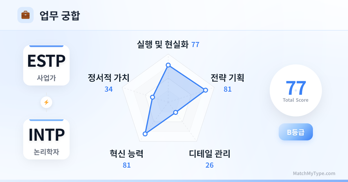 최고의 브레인스토밍 파트너입니다. 프로젝트 초기에는 놀라운 아이디어를 수없이 쏟아낼 수 있습니다. 하지만 실행 단계에서는 역할을 분담하는 것이 좋습니다. ESTP는 현장을 뛰며 사람들을 만나고, INTP는 백엔드에서 기술 지원과 기획안 작성을 맡으세요. 꼼꼼한 데이터 확인이 필요한 업무는 같이 하지 않는 것이 상책입니다.