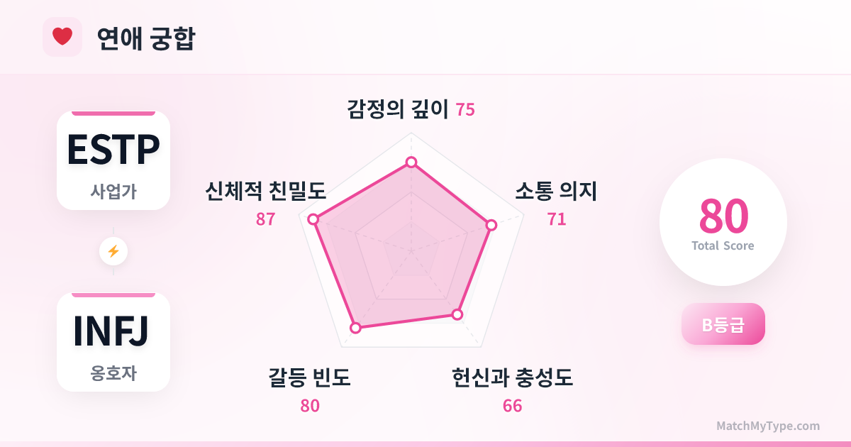 **사교 욕구의 불일치**: 주말에 ESTP는 50명이 모이는 파티에 가고 싶어 하고, INFJ는 집에서 책을 보고 싶어 합니다. 상대방에게 자신의 라이프스타일을 강요하면 관계가 무너질 수 있습니다.