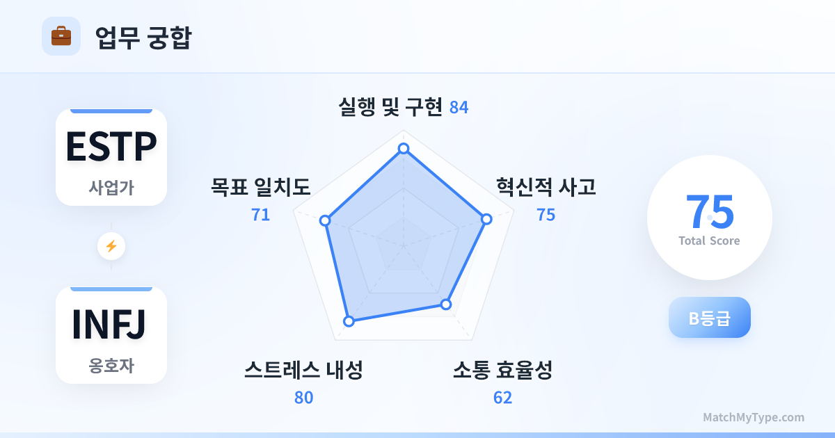 최고의 보완 관계입니다. 브레인스토밍 단계에서는 INFJ가 아이디어를 제공하고, 실행 단계에서는 ESTP가 추진력을 발휘합니다. INFJ는 기획과 전략을 맡고, ESTP는 영업과 현장 실행을 맡는 것이 이상적입니다. ESTP에게 장기 계획을 맡기거나 INFJ에게 무작위 영업(Cold Call)을 시키는 것은 금물입니다.