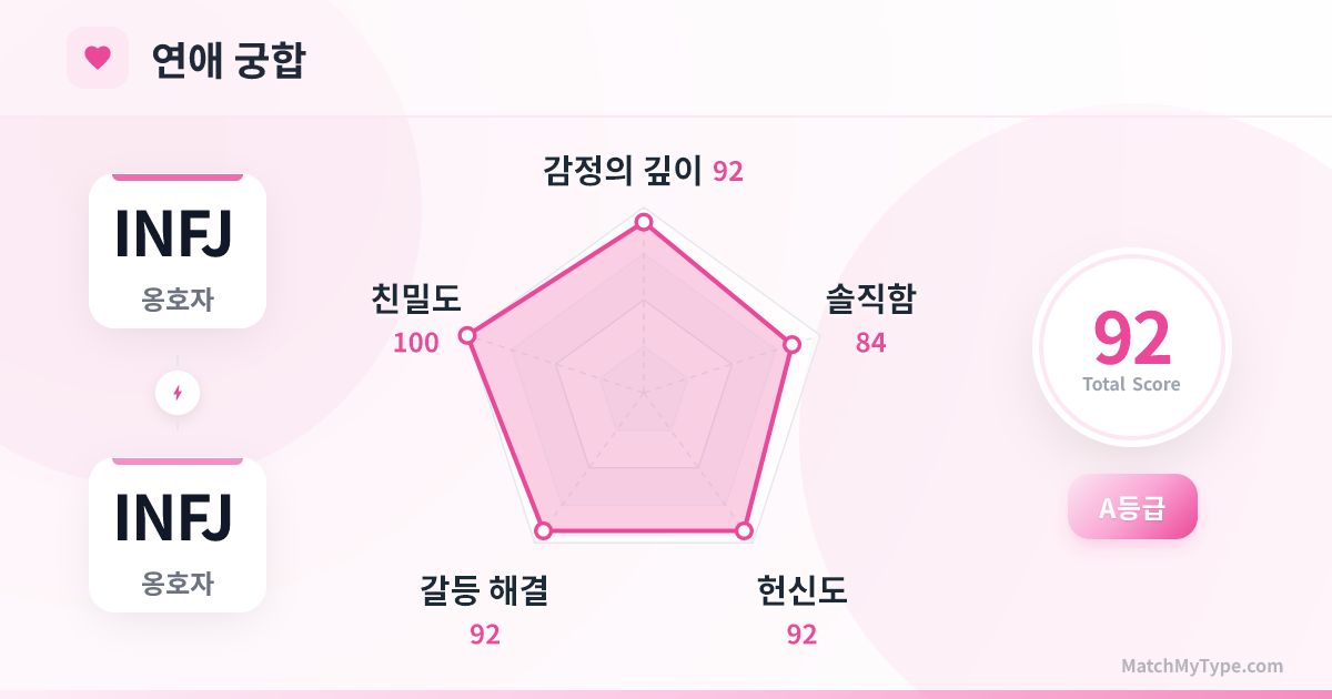 INFJ와 INFJ의 만남은 종종 '오랫동안 헤어졌던 쌍둥이를 마침내 찾은 것'으로 묘사됩니다. 오해로 가득 찬 이 세상에서 당신들은 서로에게 유일한 안식처입니다. 이 관계는 긴 설명이 필요 없으며, 눈빛만으로도 수많은 이야기를 나눌 수 있습니다. 그러나 두 개의 깊은 소용돌이가 너무 가까워지면 거대한 감정의 해일을 일으킬 수도 있습니다.
