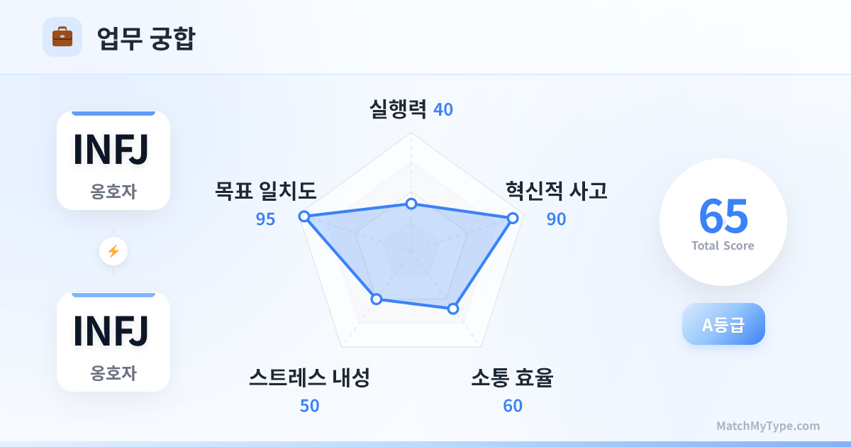 직장에서 더블 INFJ 조합은 전형적인 '꿈의 공장'입니다. 완벽한 비전, 숭고한 가치관, 깊은 통찰력을 갖추고 있지만, 이를 현실로 바꾸는 실행력이 부족한 경우가 많습니다. 누군가 진척도를 관리하지 않으면 프로젝트는 영원히 '완벽한 구상' 단계에 머물 수 있습니다.