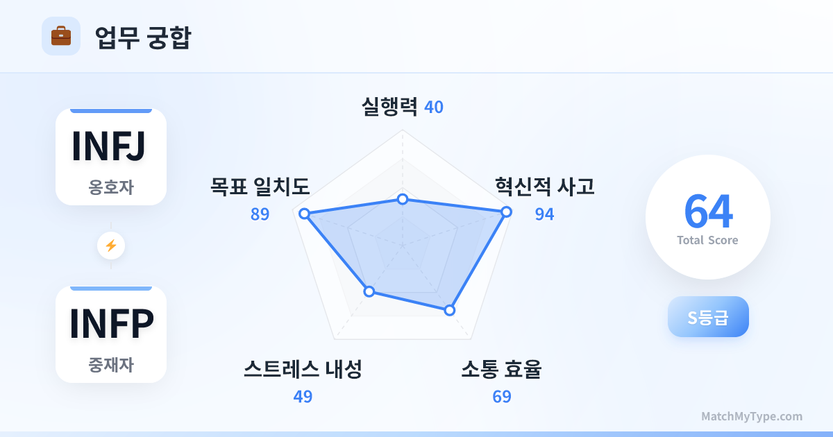 방임형 리더입니다. INFP는 누군가를 관리하는 것을 좋아하지 않기에 INFJ에게 큰 자율성을 줍니다. INFJ는 자연스럽게 '그림자 참모' 역할을 맡아 INFP의 논리적 허점과 조직 구조를 보완합니다. 다만 INFJ는 INFP의 결단력 부족에 피로감을 느낄 수 있습니다.