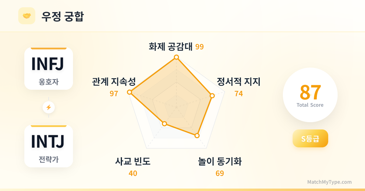 MBTI에서 가장 강력한 '비전+실행' 조합 중 하나입니다. INFJ가 웅장한 청사진을 그리고 사람들의 마음을 모으면, INTJ는 시스템 프레임워크를 구축하고 강력하게 실행합니다. 목표만 일치한다면 당신들은 거의 모든 장애물을 파괴할 수 있습니다.