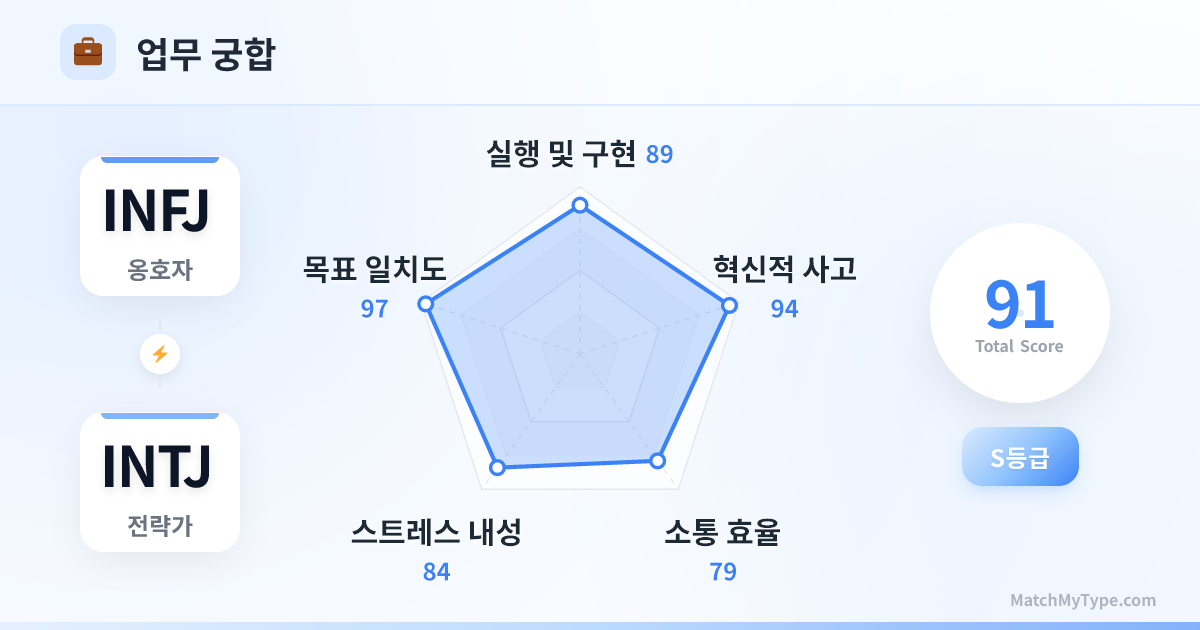각자의 영역을 지키는 엘리트들. 역할 분담이 명확한 것이 좋습니다. INTJ는 시스템, 데이터, 논리적 구조를 맡고, INFJ는 고객, 카피라이팅, 팀 조율을 맡습니다. 회의 시 INFJ가 분위기를 띄우고, INTJ가 논리적 결과물을 내놓으며, INFJ가 마지막에 의미를 부여하며 마무리하는 것이 완벽한 루프입니다.