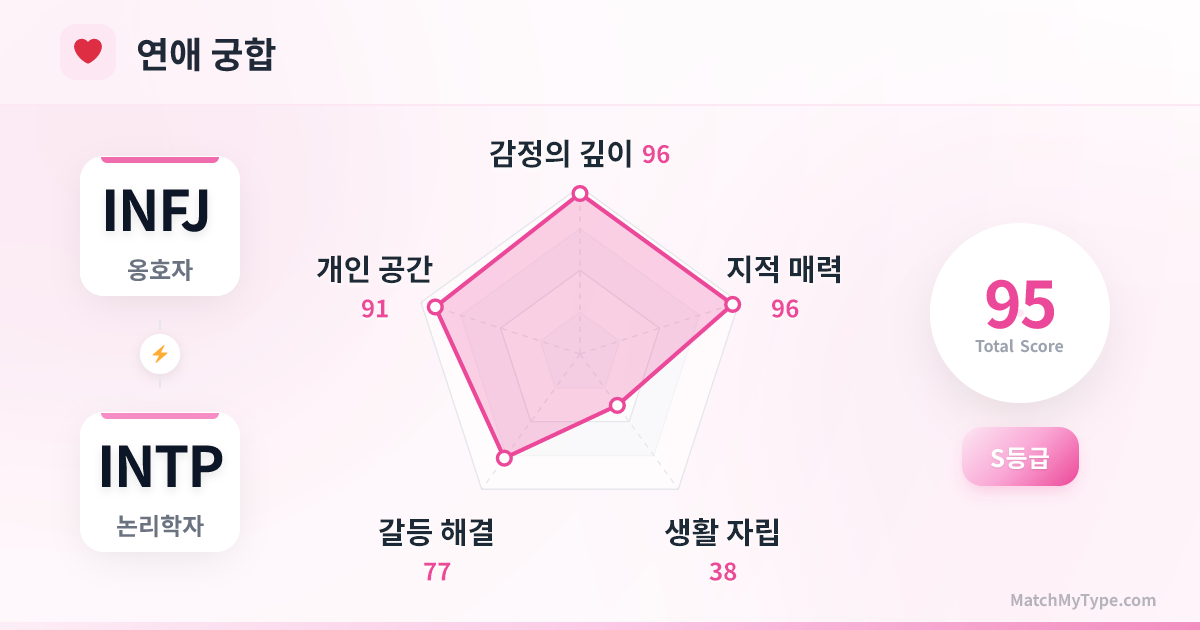 INFJ는 종종 자신이 세속적으로 이해받지 못하는 외계인 같다고 느끼지만, INTP는 마침 그 '외계어'를 해독할 수 있는 논리 체계를 가지고 있습니다. INTP는 INFJ의 깊은 통찰력과 신비로운 따뜻함에 매료되며, INFJ가 자신의 무표정 뒤에 숨겨진 감정의 변화를 읽어내는 것에 놀라워합니다. INFJ는 INTP의 지극히 순수하고 꾸밈없는 진리 추구와 논리 구축 능력에 빠져들며, INTP의 객관적인 시각은 INFJ의 감정적 폭풍 속에서 유일한 안식처가 되어줍니다.