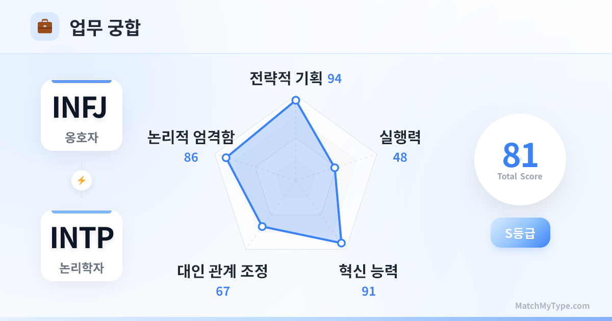 거시적 관점의 완벽한 통일. INFJ는 '사람 요인'과 '시장 트렌드'를 파악하는 데 능숙하고(Ni+Fe), INTP는 복잡한 기술적 난제와 시스템 설계(Ti+Ne)에 강합니다. IT 기업이라면 INTP가 CTO, INFJ가 CPO(최고 제품 책임자)나 CHO(최고 인사 책임자)를 맡아 기술적 깊이와 인문학적 배려가 공존하는 제품을 만들 수 있습니다.